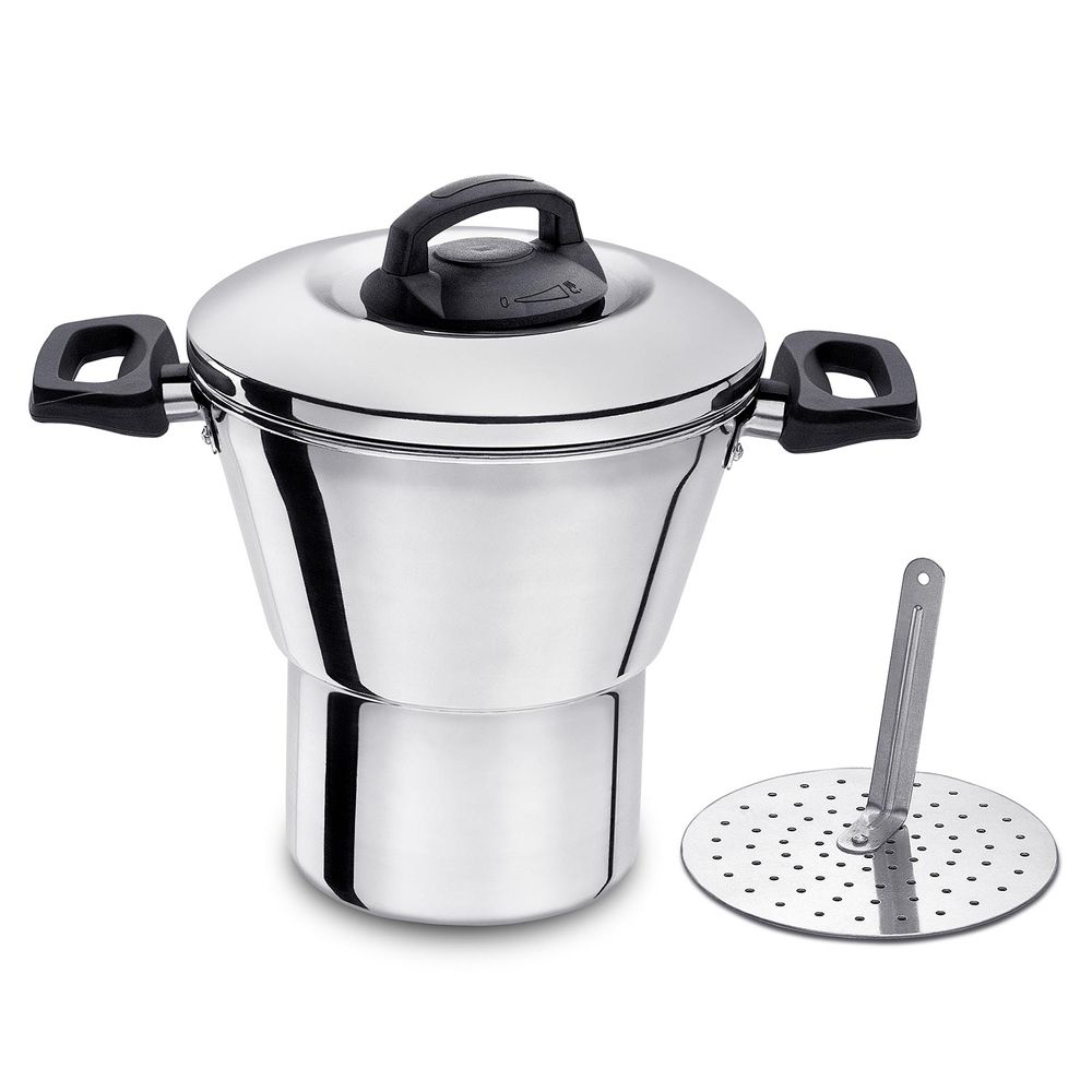 Utensílio culinário, para o preparo de cuscuz ou legumes no vapor, suas características proporcionam um cozimento uniforme.