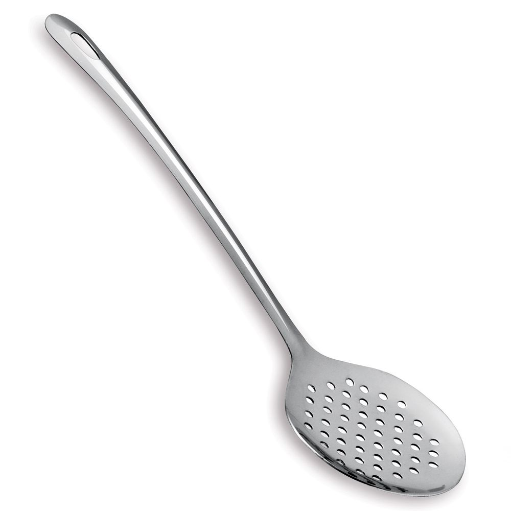 Escumadeira Inox, produto de alta qualidade e material inoxidável, seu design moderno conta com cabo vazado para pendurar, produto indispensável em sua cozinha.