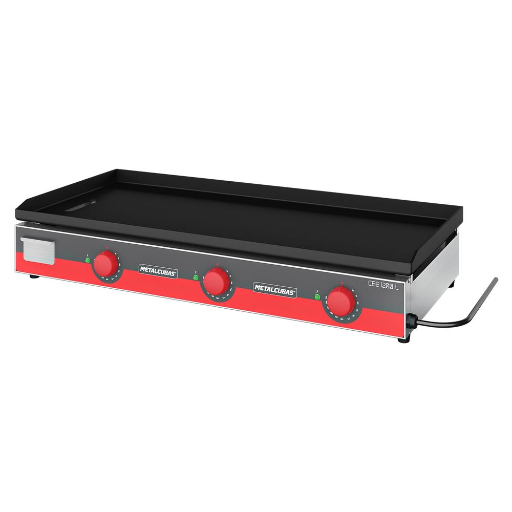 Termostato individual por resistência, chapa superior dobrada em aço SAE 1020. Fechamentos laterais e painel frontal em aço inox 430 escovado, gaveta de gordura independente e pés de borracha antiderrapante com regulagem.