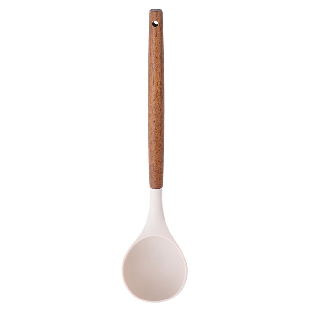 A Concha de Silicone Cor Creme com Cabo em Madeira é uma peça funcional e elegante, ideal para facilitar o manuseio de ingredientes ou aplicação de produtos.