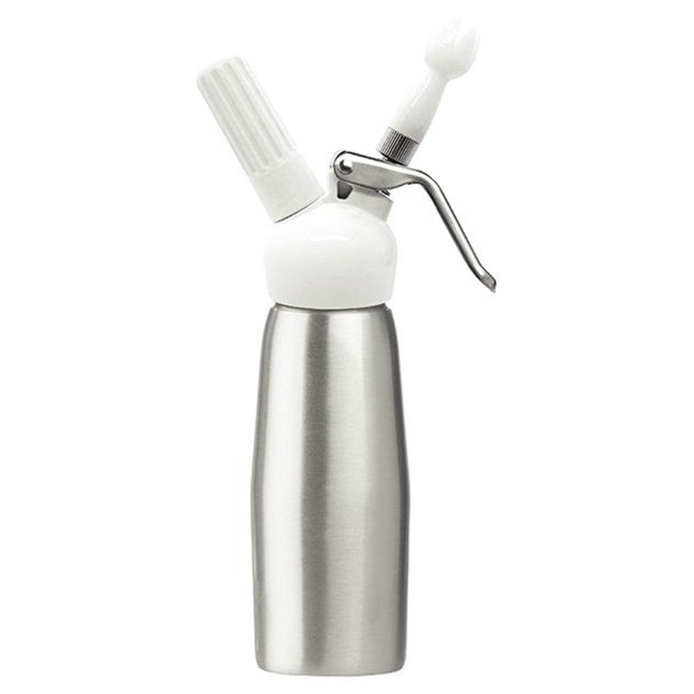 A Garrafa para Chantilly 500 ml em Alumínio Hauskraft é feito em garrafa com cápsula de gás é de longe o mais fresco e o mais cremoso que você já provou. Quando se utiliza a Garrafa para Chantilly 500 ml em Alumínio Hauskraft não há desperdício, pois o que você não utilizar pode permanecer fresco na garrafa por até duas semanas na geladeira.