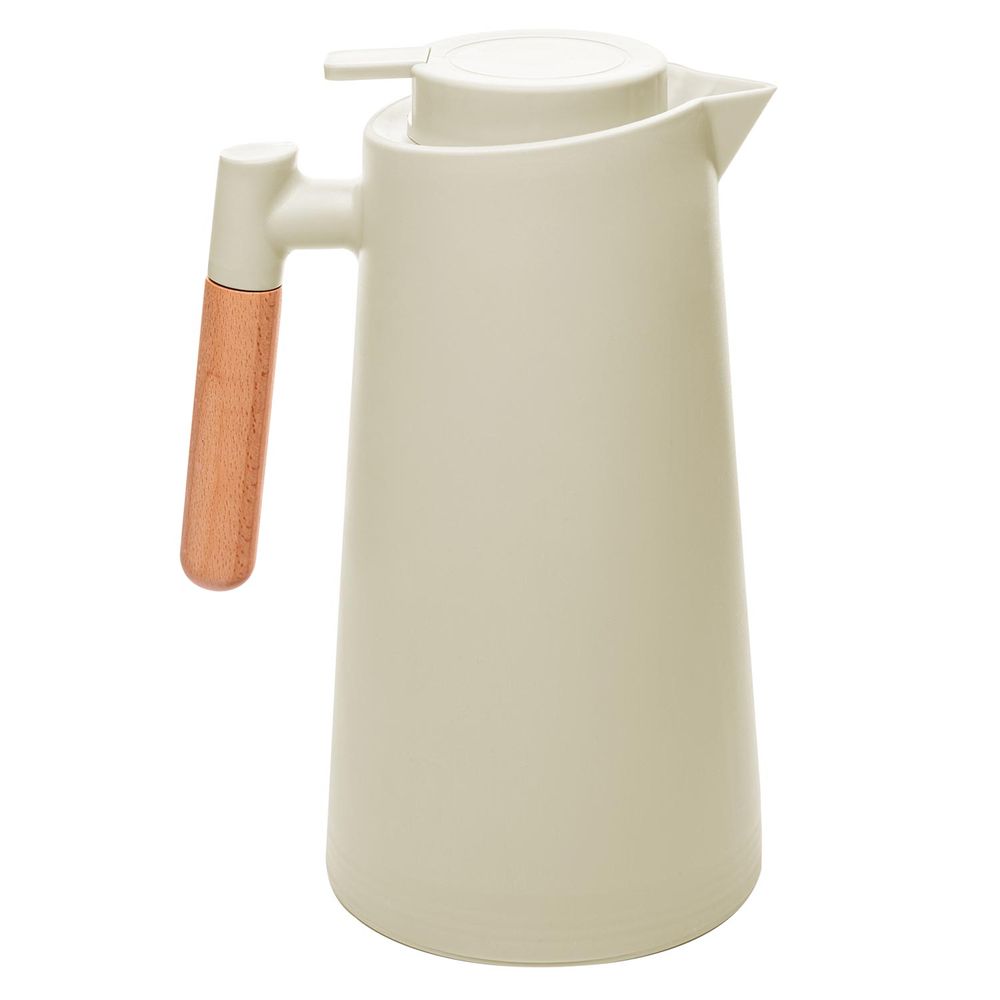 Com um acabamento em tom de menta e um cabo de madeira, esta garrafa térmica apresenta um design contemporâneo refinado que se destaca em qualquer ambiente, adicionando um toque de sofisticação à sua mesa.