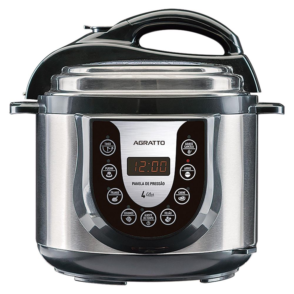 A Panela de Pressão Elétrica Agratto 4 Litros com Timer 127v possui Painel digital com 6 funções pré definidas, prepare pudim, arroz, feijão, carnes e legumes com apenas um toque, além disso pode ser usada para cozinhar, refogar ou aquecer outros alimentos. Mais segura que panelas de pressão comum.